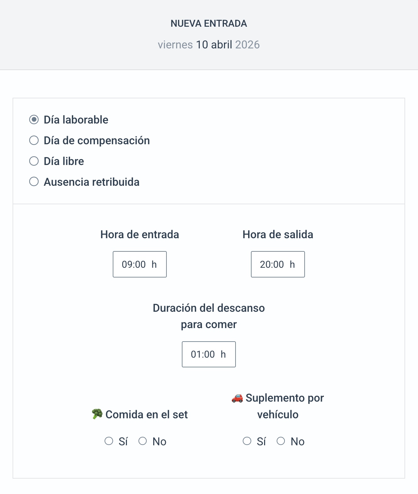 Día laborable: En ese caso incluirá toda la información que se le solicite según la configuración del formulario.