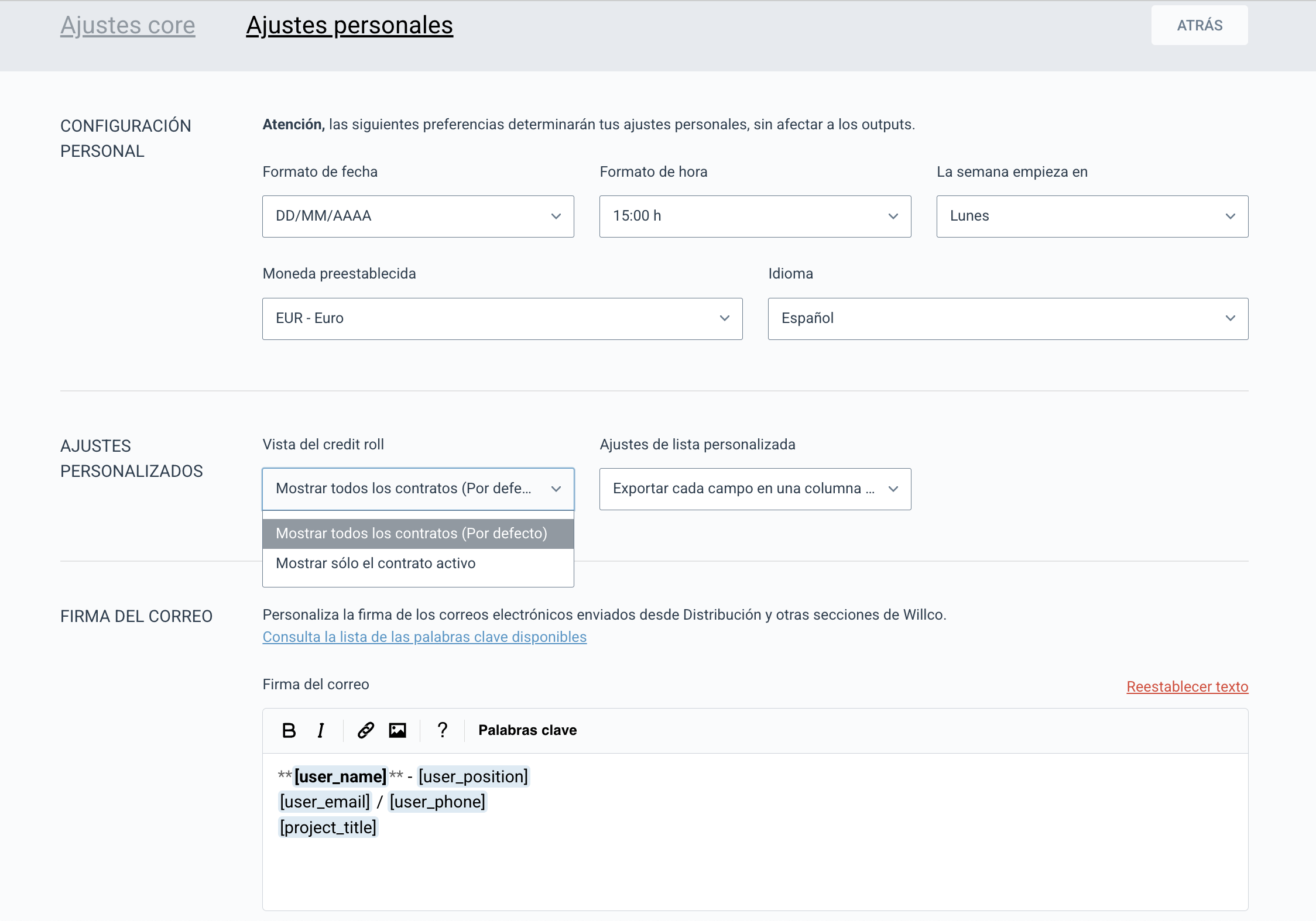 - Tú firma: que se usará en las comunicaciones que haces mediante willco, incluyendo las notificaciones del registro de jornada